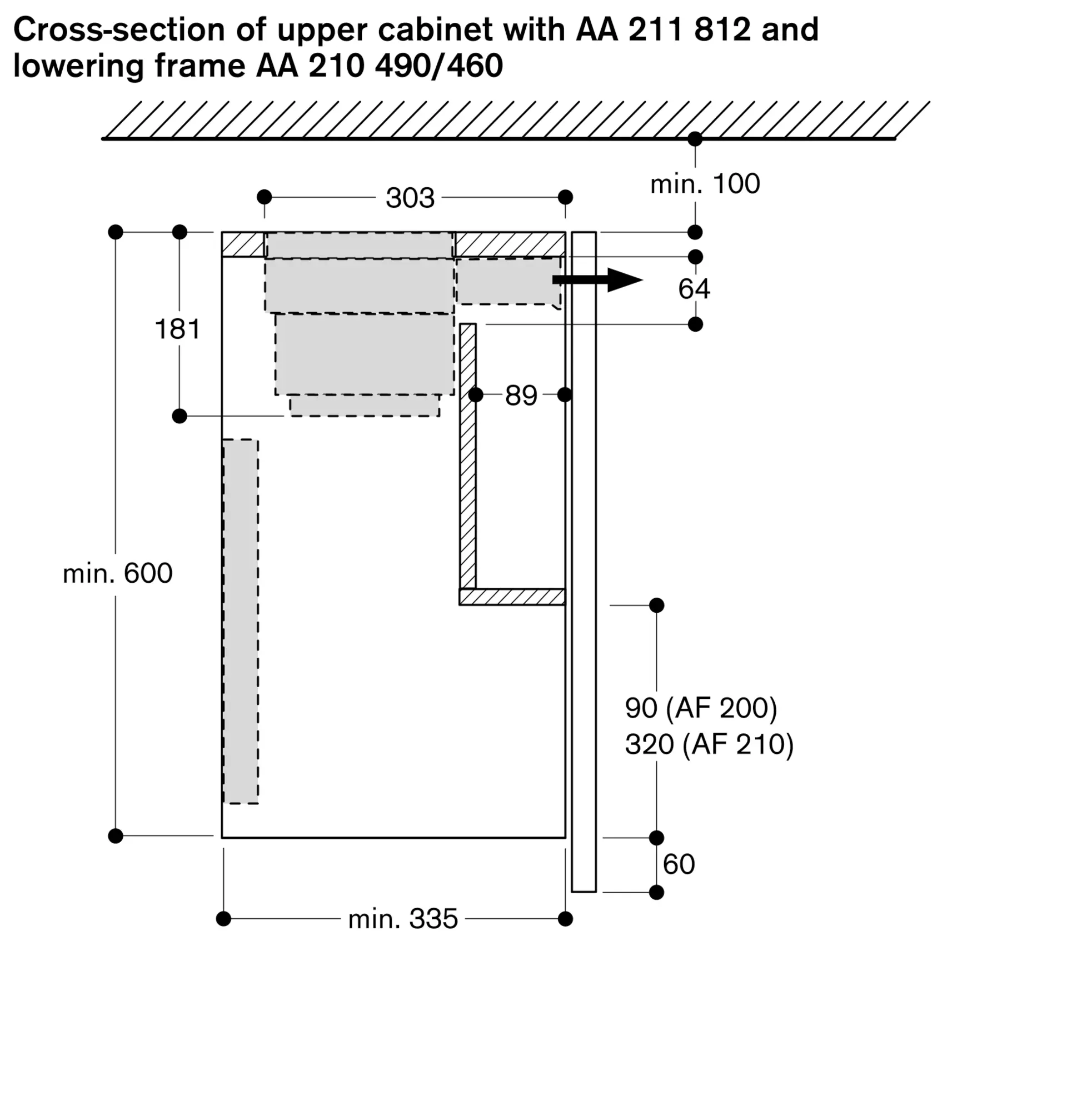 The required cavity depth of the upper cabinet together with the lowering frame measures 335 mm.