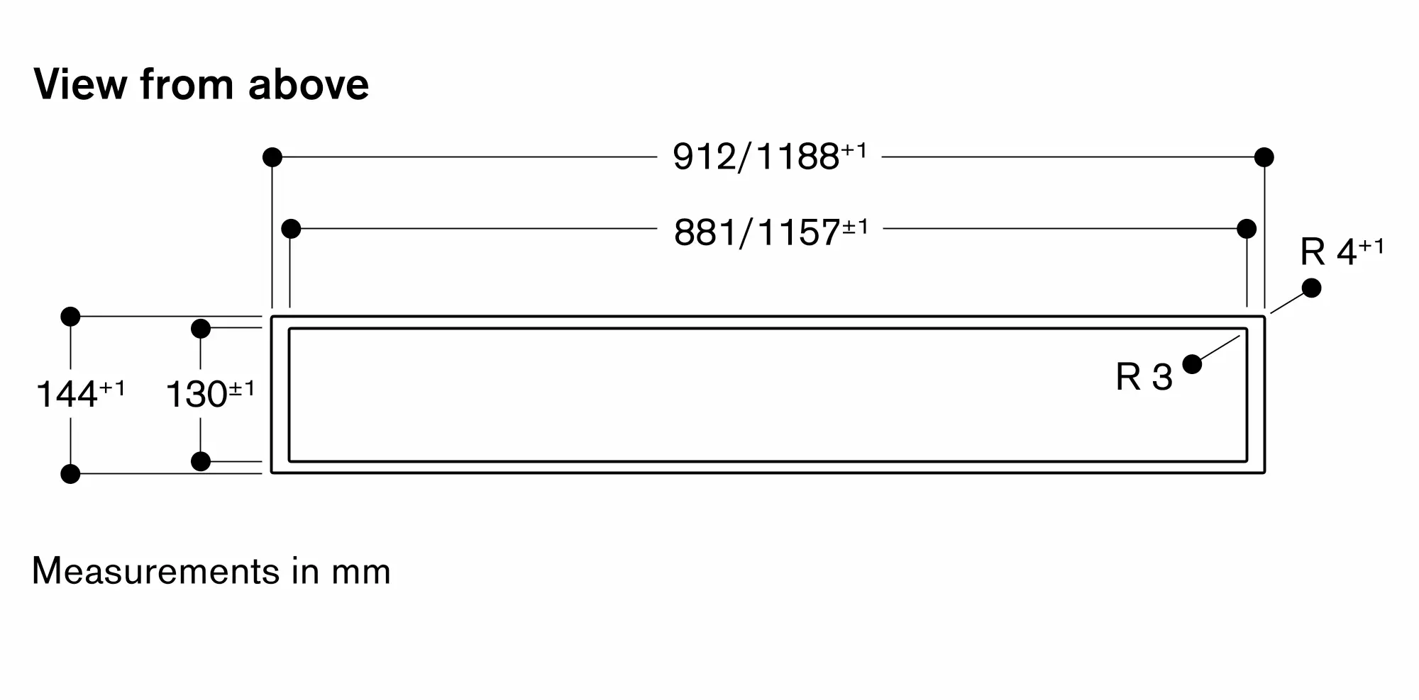 The bearing capacity and stability, in the case of thin worktops in particular, must be supported using suitable substructures. Take into account the appliance weight and additional loads.