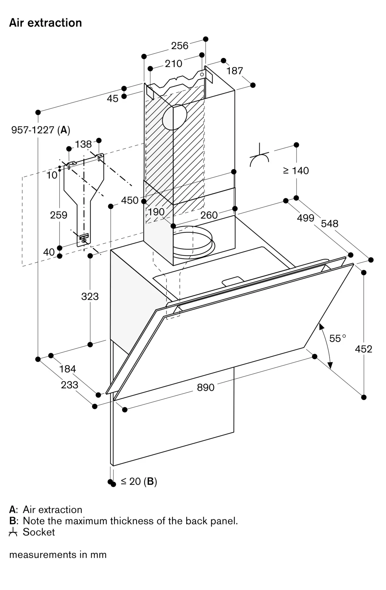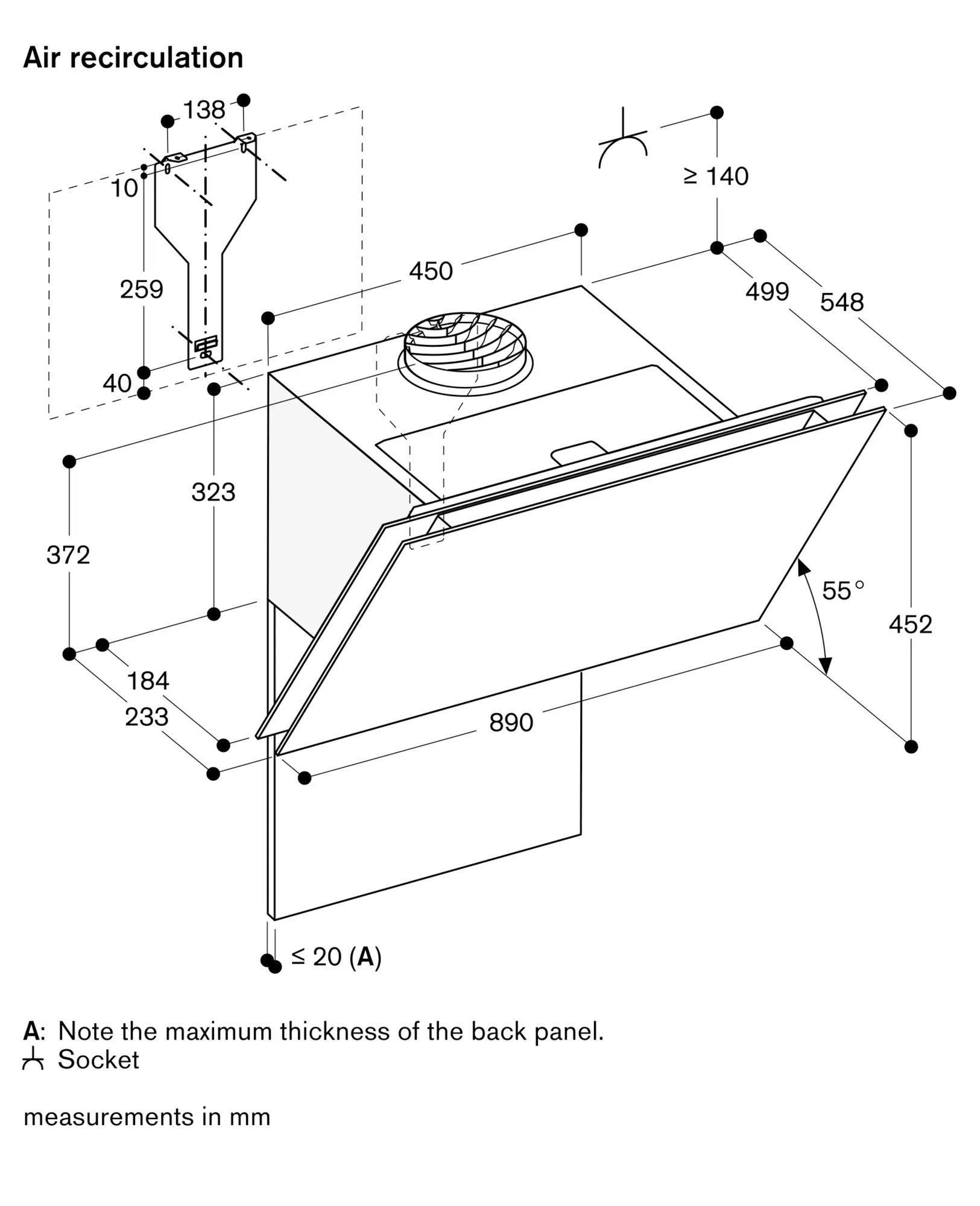 Clearance above electric appliances min. 45 cm.