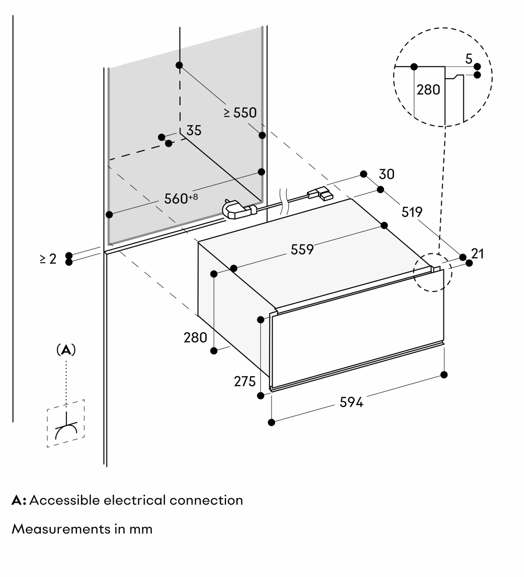 The socket can be planned behind the appliance.
