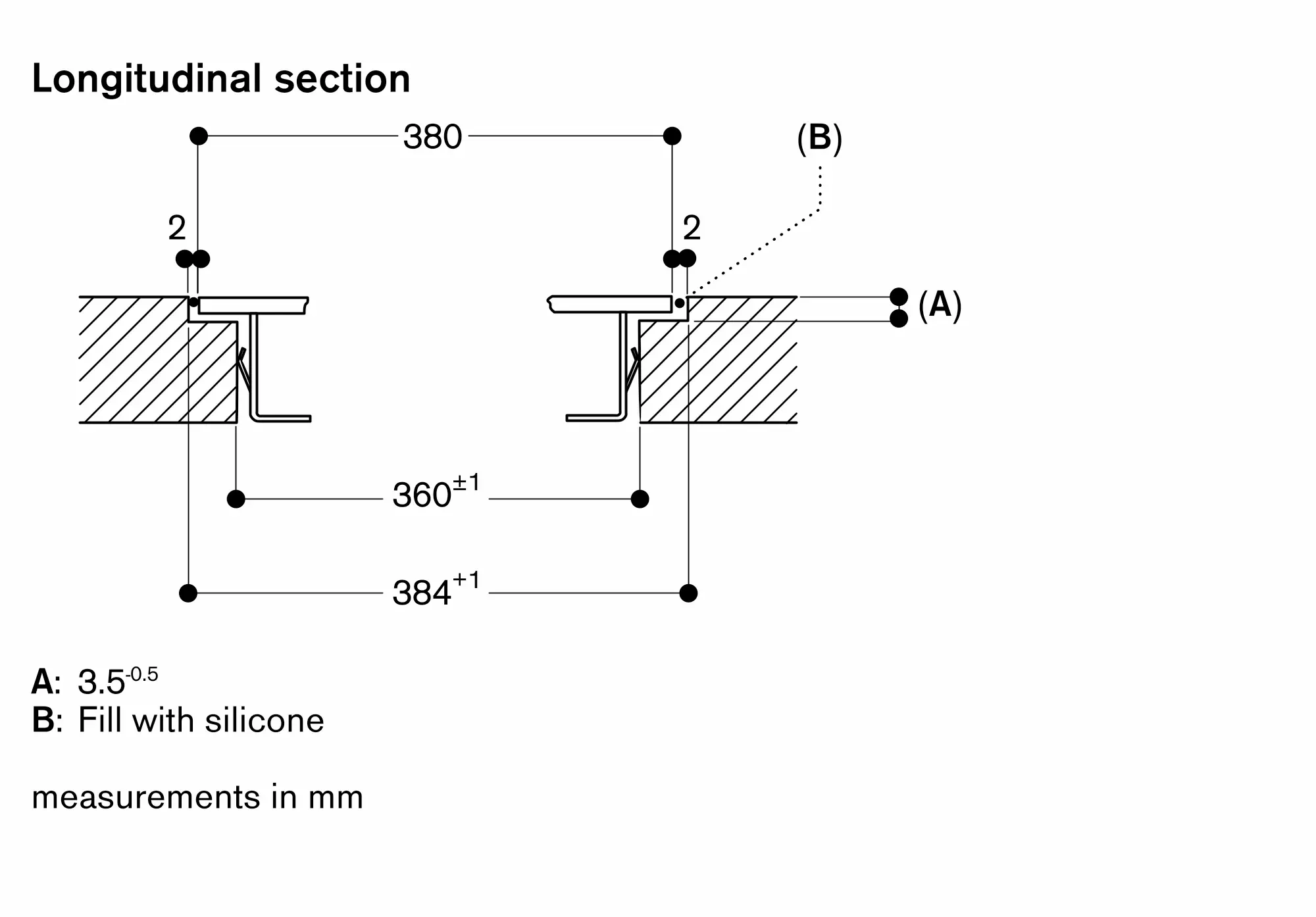 The bearing capacity and stability, in the case of thin worktops in particular, must be supported using suitable substructures. Take into account the appliance weight and additional loads.