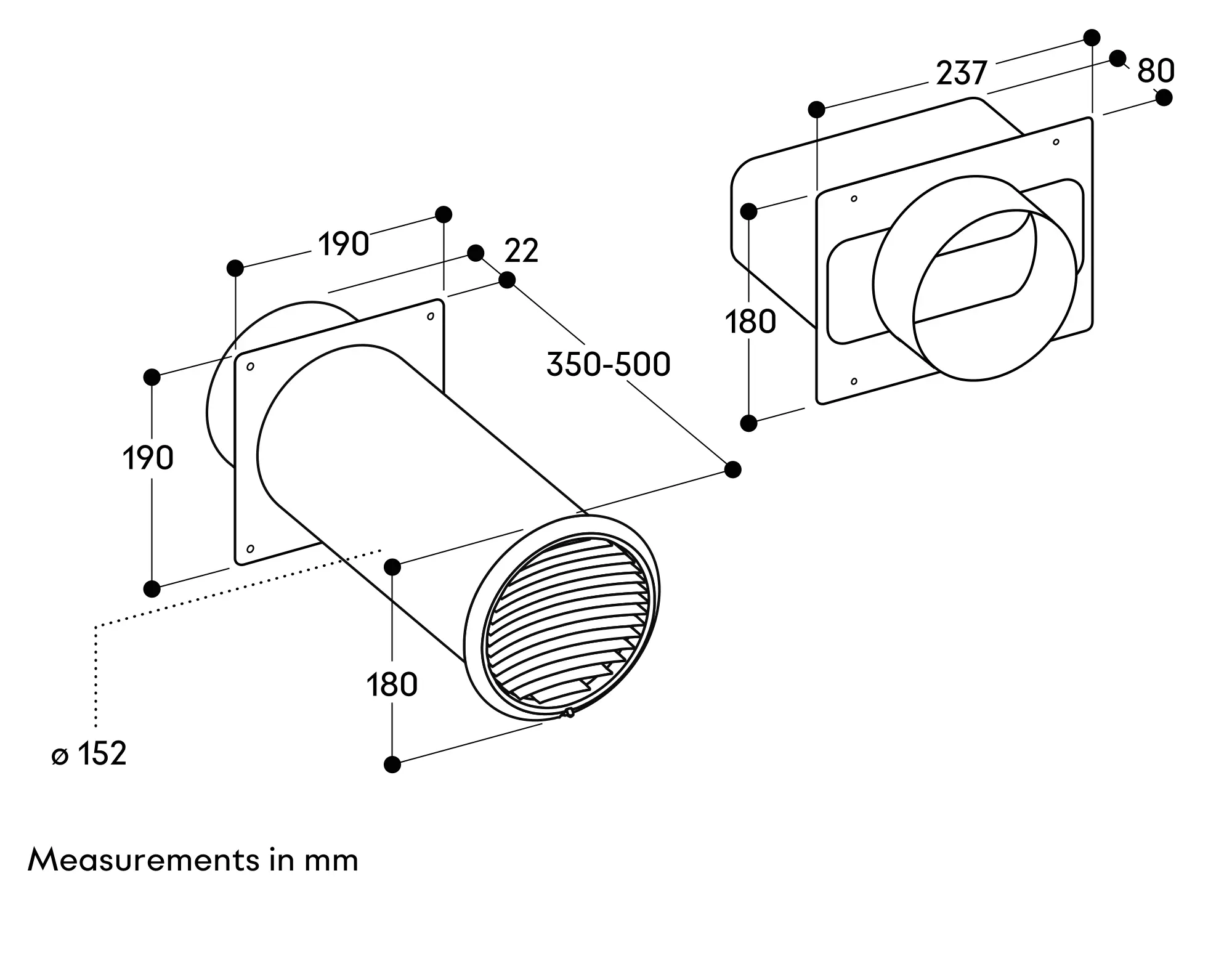 For connection of round pipe DN 150 or flat pipe DN 150.