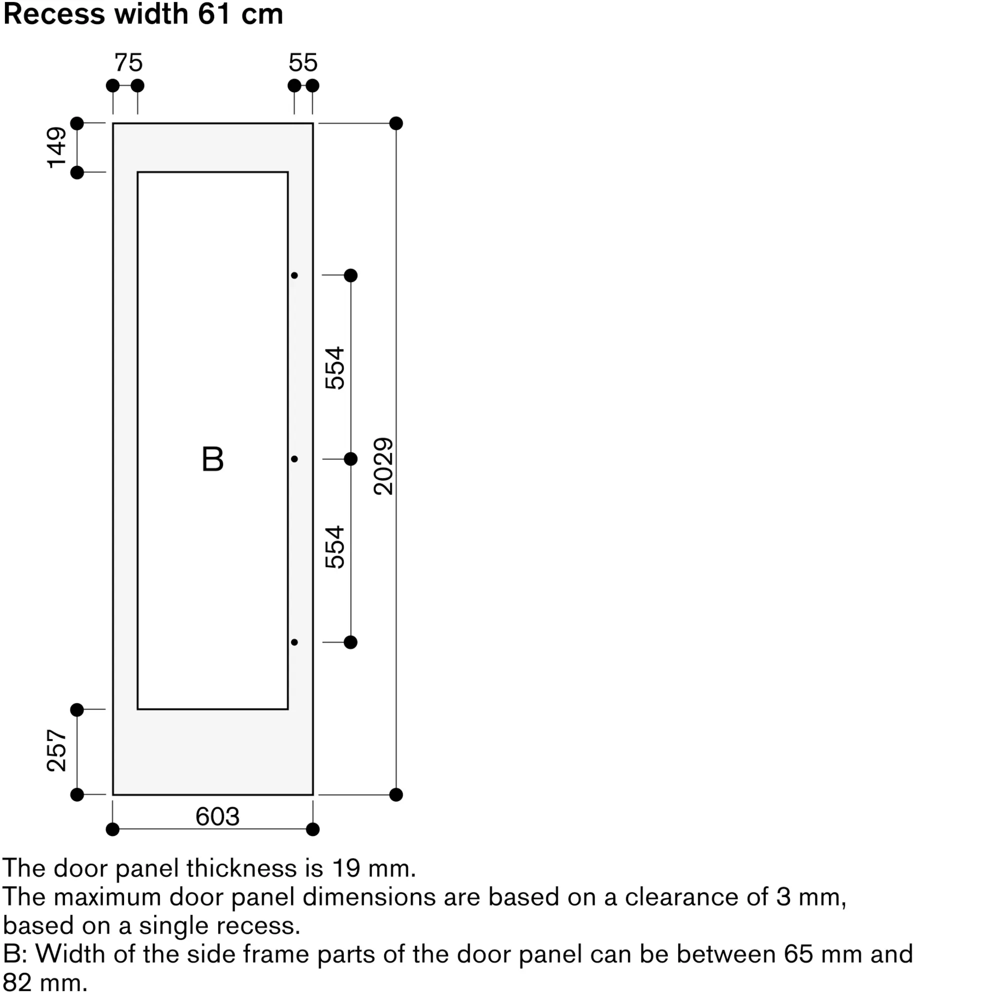 For 61 cm wide appliances, left-hinged, panel thickness 19 mm.