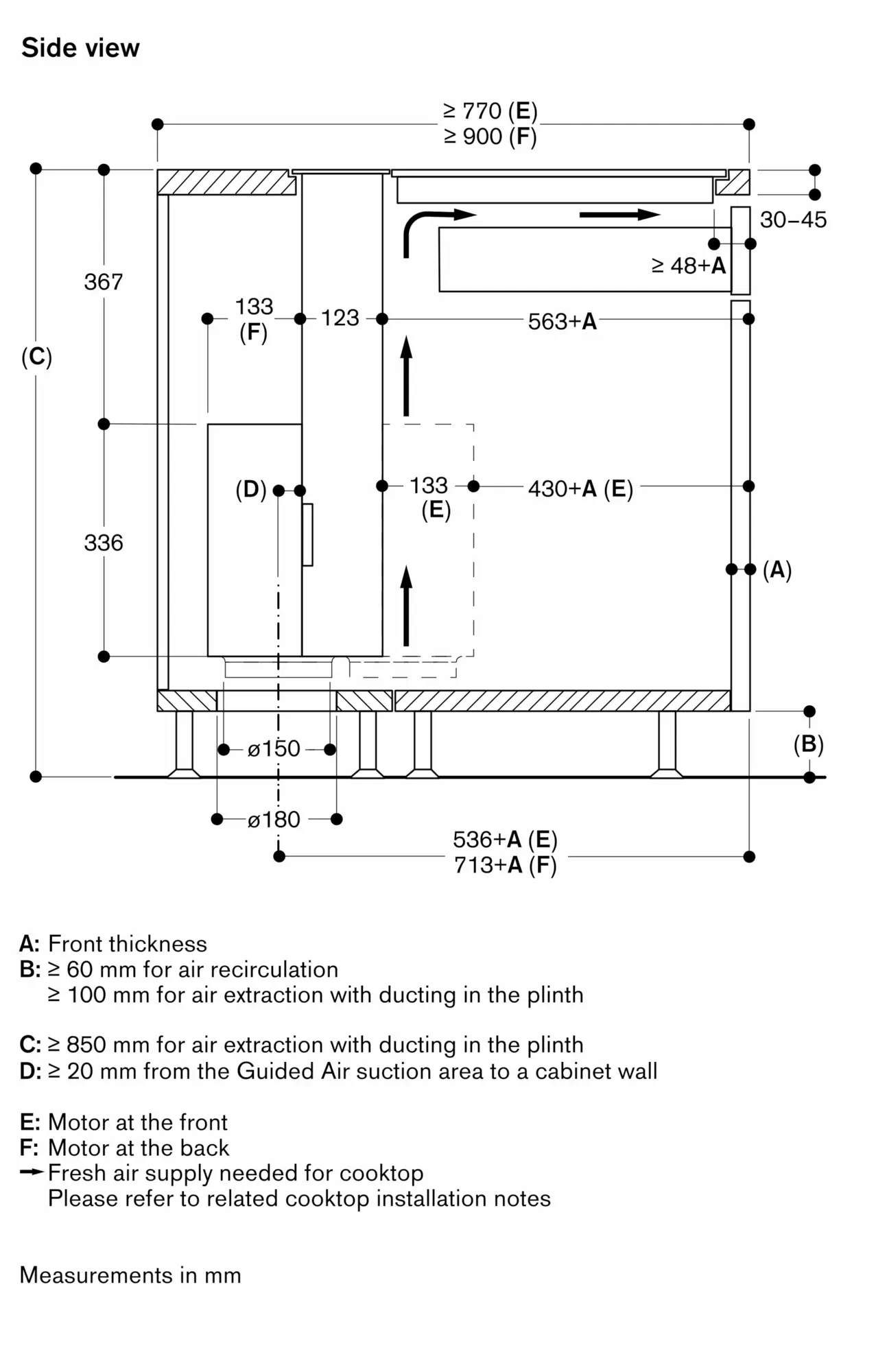 - 50 cm left and right of the table ventilation to the wall or neighbouring tall cabinets. - 5 cm from the table ventilation frame to the wall.