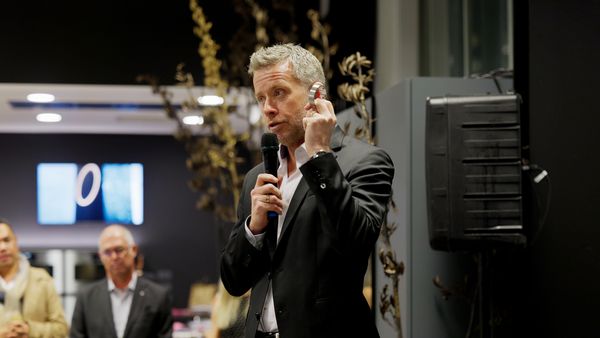 Exterior night shot of a modern building with "Gaggenau" illuminated on its facade.